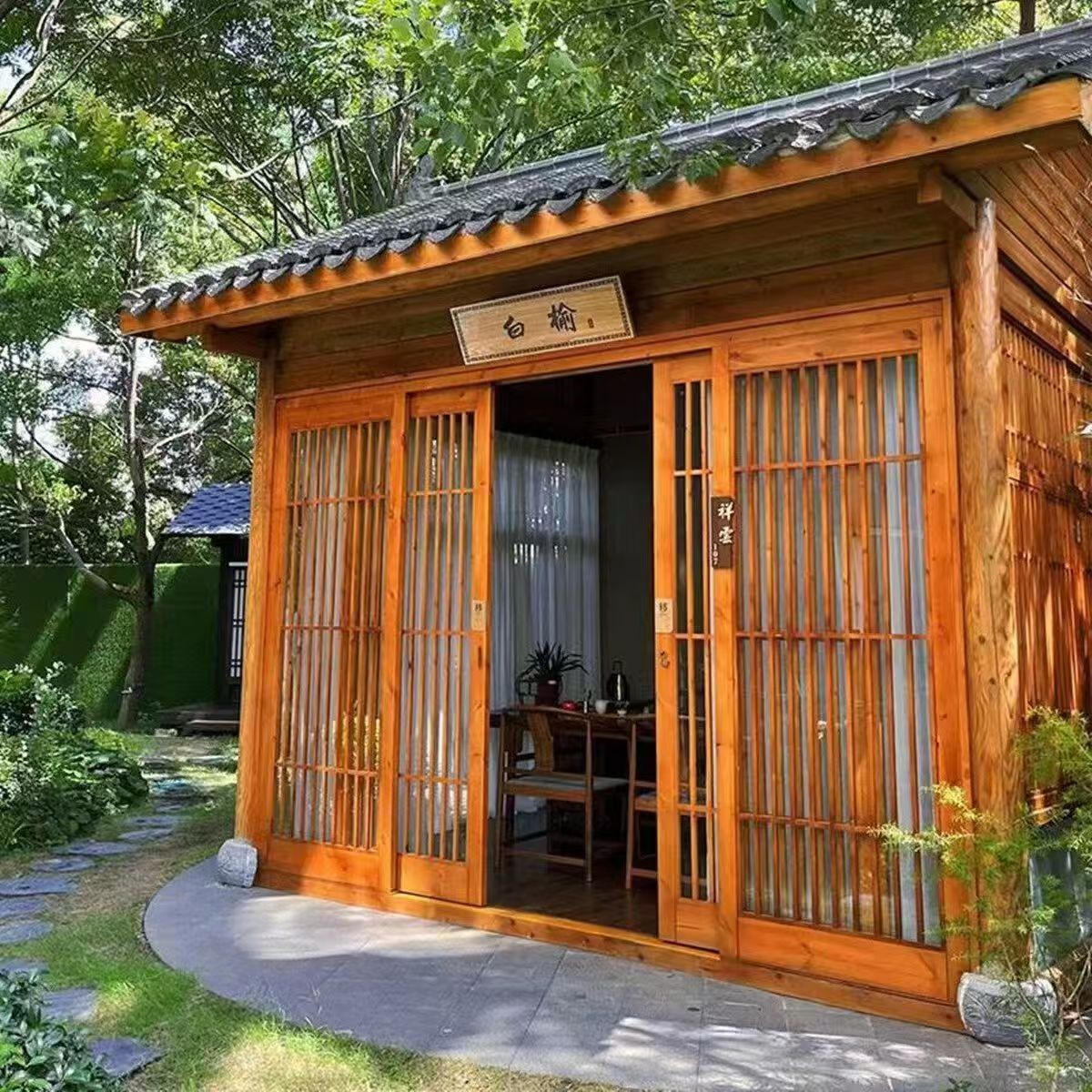 浙江古朴木屋藏林间,格栅窗棂透柔光, 临水而建映倒影,石径青苔岁月长,夜灯初上暖人心,偷得浮生半日闲
